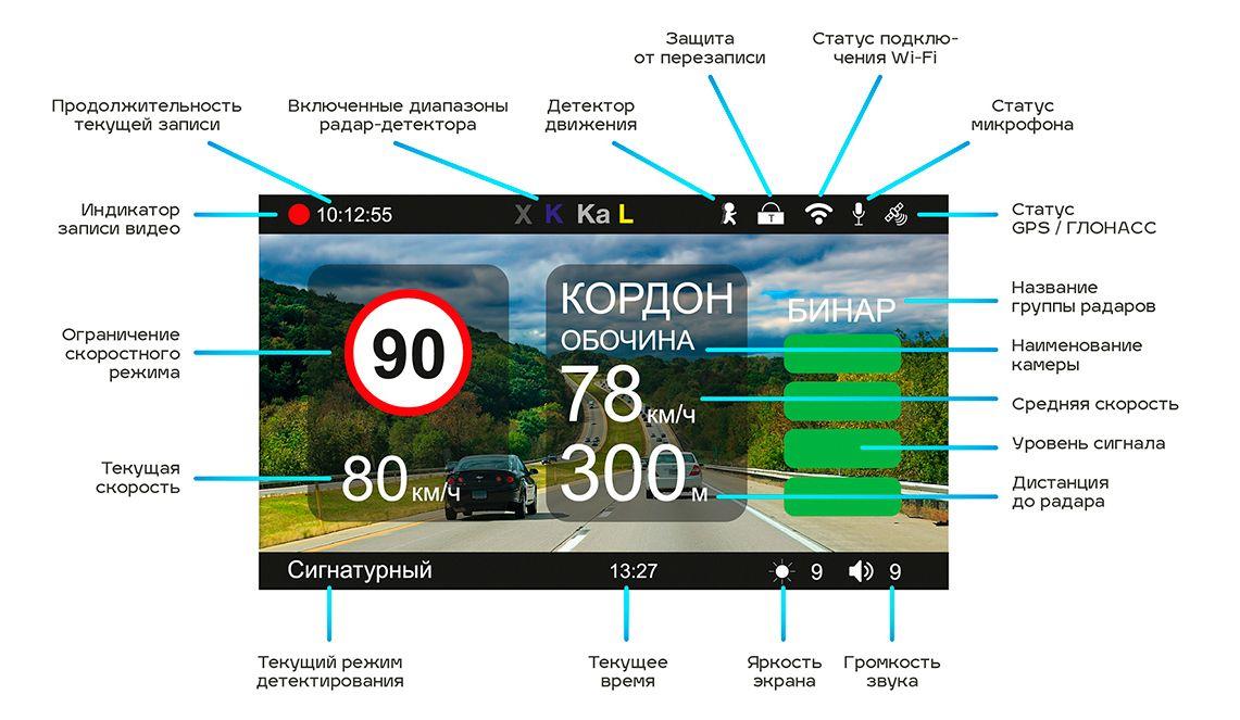 - 6 режимов работы радар-детектора ("Сигнатурный", "Трасса", "Город", "IQ", "Только GPS" и "Только радар")