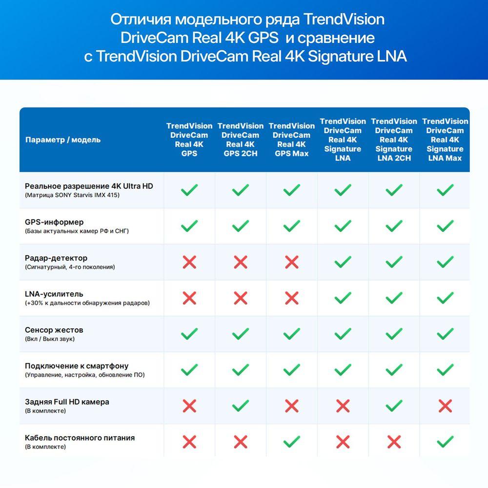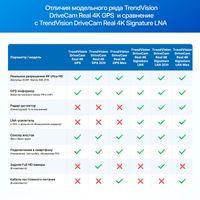 Линейка TrendVision DriveCam Real 4K включает две модификации — GPS и Signature LNA. Обе модели обладают реальным разрешением съёмки 4K Ultra HD, оснащены матрицей Sony Starvis IMX415, поддерживают работу через мобильное приложение и отличаются высокой стабильностью записи. Однако существуют важные различия, которые позволяют выбрать устройство под конкретные задачи.