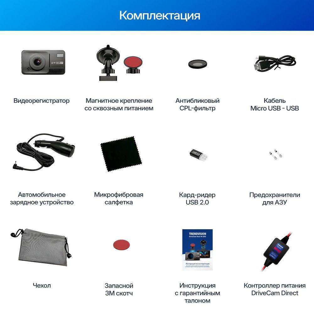 Видеорегистратор с реальным разрешением 4К Ultra HD, управлением через смартфон) и встроенным GPS-информером. Кабель прямого подключения TrendVision DriveCam Direct (+парковочный режим) в комплекте