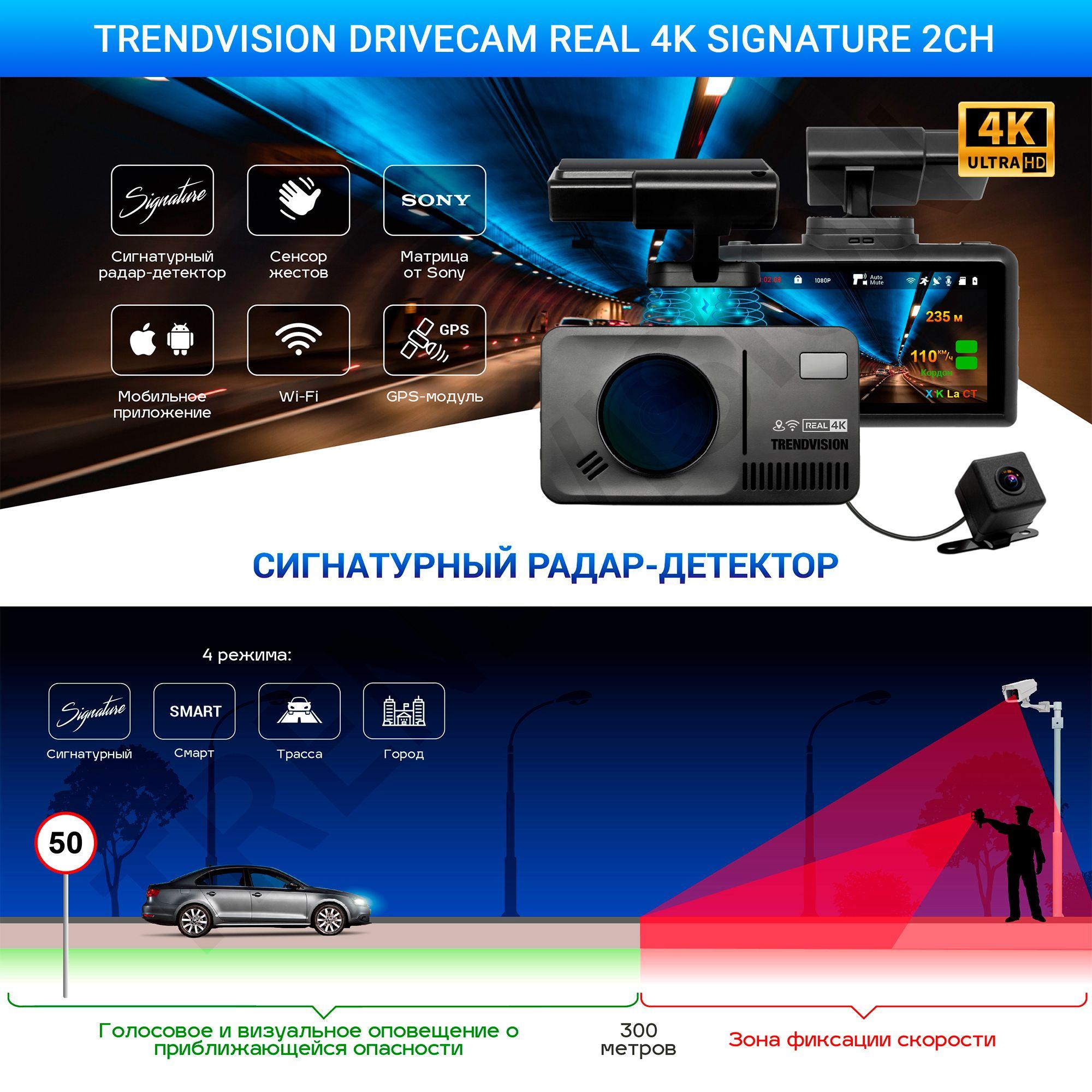TrendVision DriveCam Real 4K Signature 2CH - инновационное двухканальное комбо-устройство 3 в 1, включающее в себя видеорегистратор с реальным разрешением съёмки 4K (Ultra HD), сигнатурный радар-детектор с 4 режимами и GPS-информатор. Также, аппарат обладает возможностью управления и просмотра видео через мобильное приложение, благодаря встроенному Wi-Fi. Сенсор жестов позволяет одним взмахом руки отключить звук на аппарате или сделать фото.