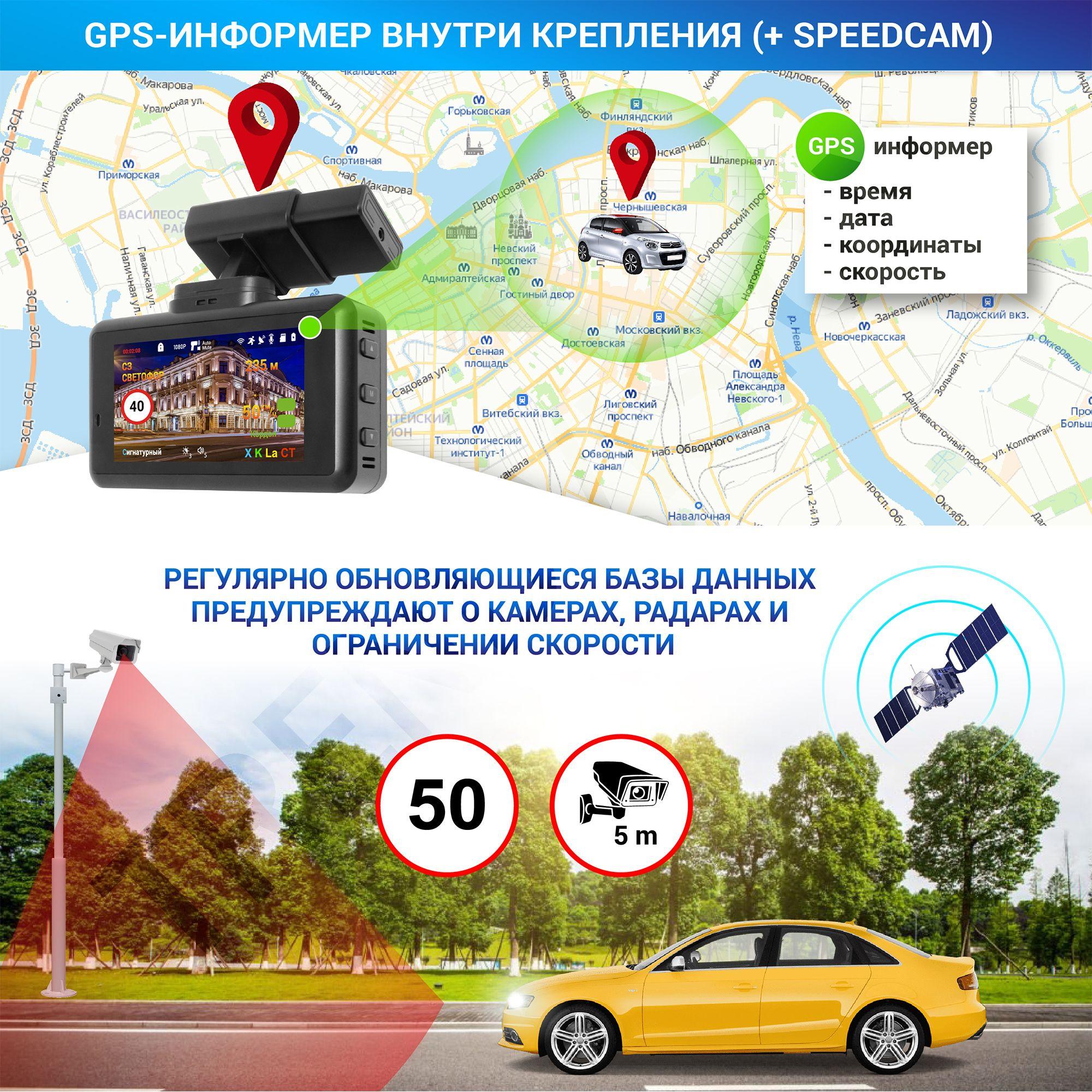 Благодаря встроенному GPS-модулю, аппарат синхронизируется со спутником и автоматически предоставляет актуальные дату, время, скорость и точные координаты. Это обеспечивает весомой доказательной базой в случае ДТП.