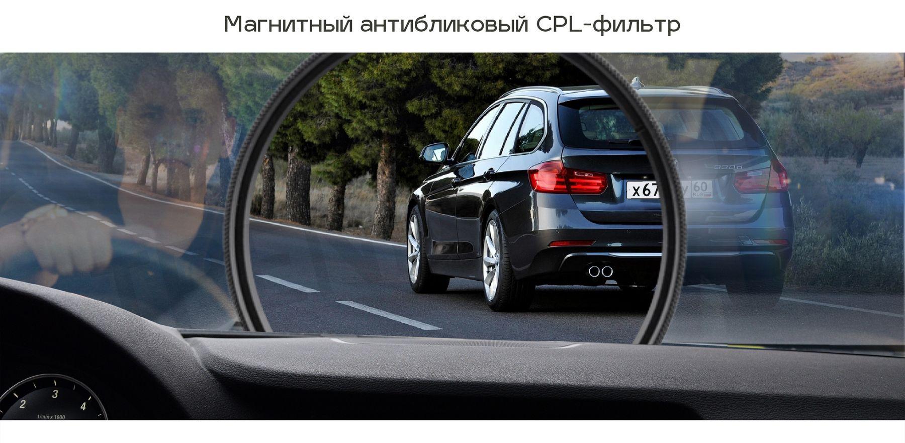 В комплекте c устройством имеется магнитный антибликовый CPL-фильтр, который является незаменимым инструментом для подавления отражений. Он исключает блики / засвечивания от солнца и отражения на лобовом стекле автомобиля, повышая «чистоту» картинки и детальность фиксации дорожных событий.
