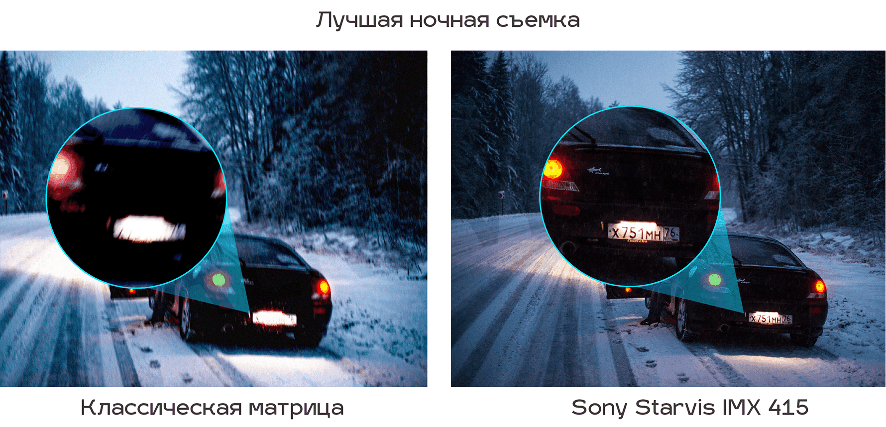 Благодаря матрице SONY STARVIS IMX415, в сочетании с мощным процессором, в ночное время суток аппарат снимает на порядок лучше подавляющего большинства альтернативных видеорегистраторов. Вне зависимости от условий освещения, самые важные детали дорожных происшествий стабильно фиксируются даже на больших расстояниях.