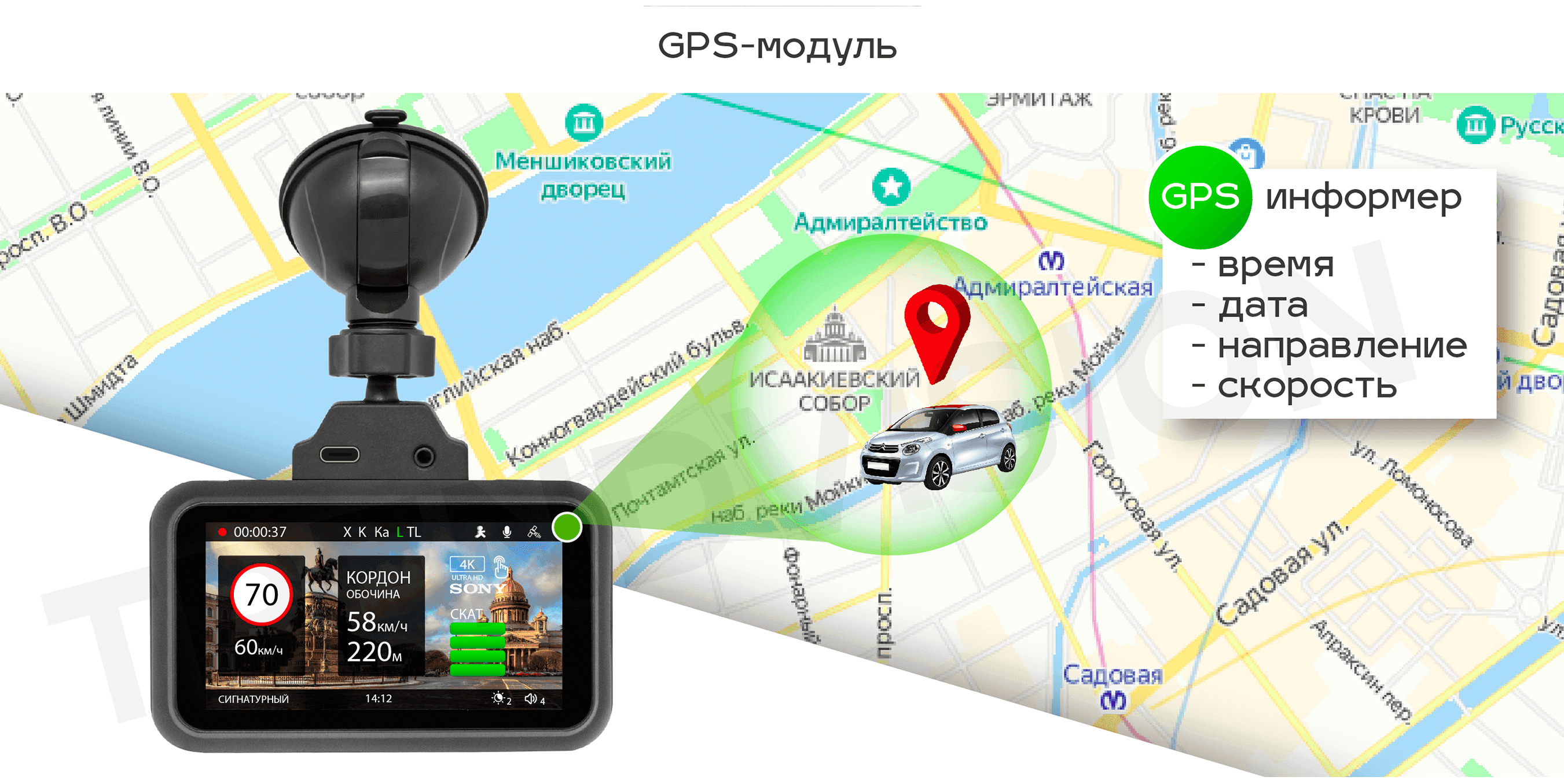Благодаря выносному GPS-модулю на видео отображается штамп даты, времени, координат и скорости движения. Это создает весомую доказательную базу в случае ДТП. Кроме того, TrendVision Hybrid Signature Real 4K обладает системой предупреждений SpeedCam, за счет которой устройство предупредит вас о всех возможных «опасностях» на пути (посты ДПС, камеры фиксации скорости, радары и т.д.). Голос оповещений (мужской или женский) можно менять, обновляя прошивку в мобильном приложении, с помощью Wi-Fi.