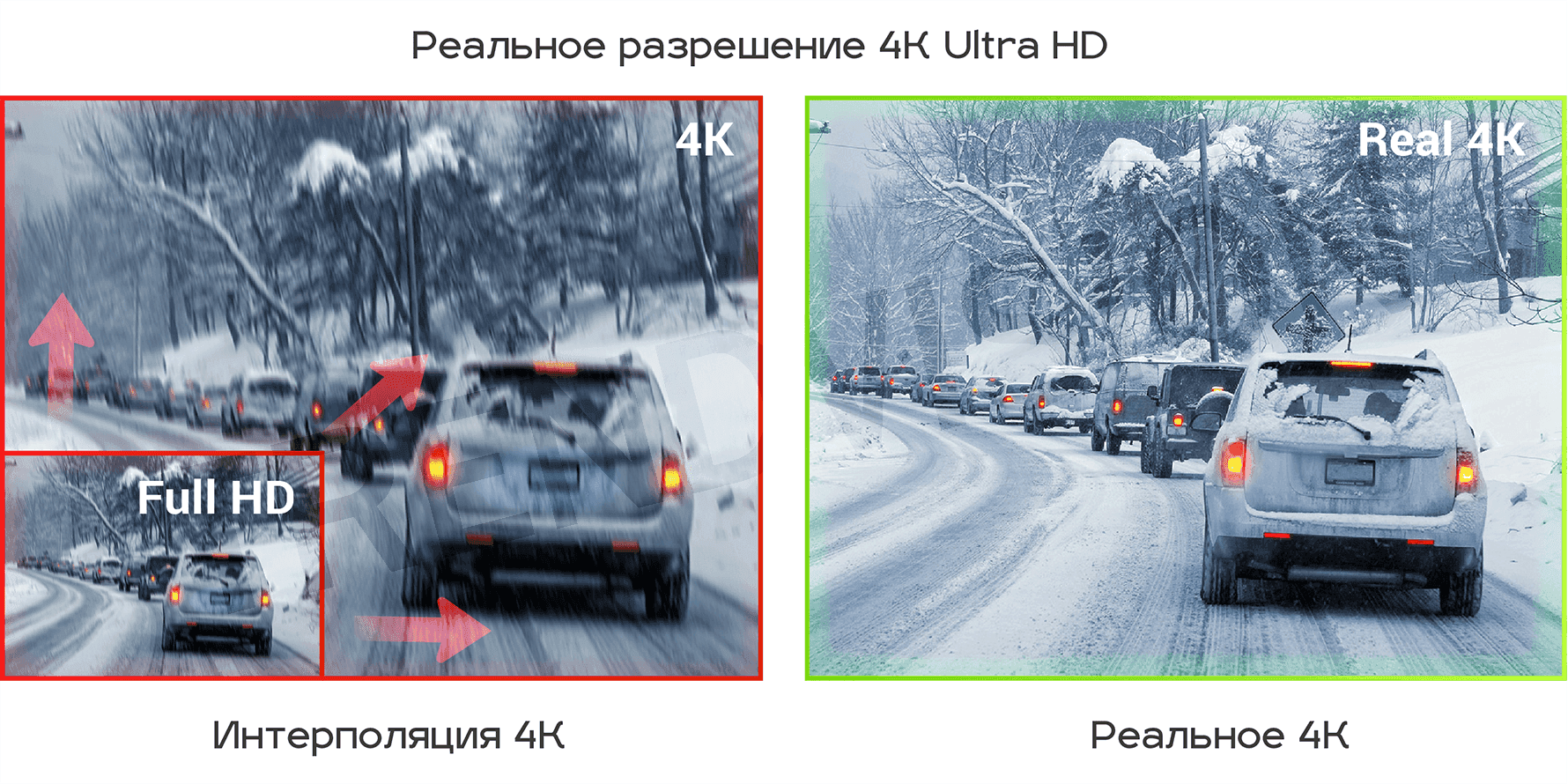 TrendVision Hybrid Signature Real 4K задаёт стандарт реального разрешения 4K Ultra HD. Обычно, на регистратора других производителей, показателя 4К добиваются за счёт интерполяции: искусственно растягивают 2К (иногда даже Full HD) до размеров 4К – от этого качество видео не увеличивается, а по прежнему остается уровня Full HD.