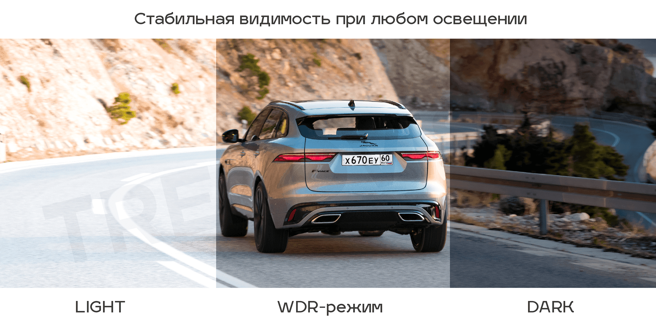 TrendVision Hybrid Signature Real 4K 2CH оснащен функцией расширения динамического диапазона WDR, обеспечивающей сбалансированное изображение в сложных условиях освещения: при встречных фарах, прямых солнечных лучах и выезде из туннеля.