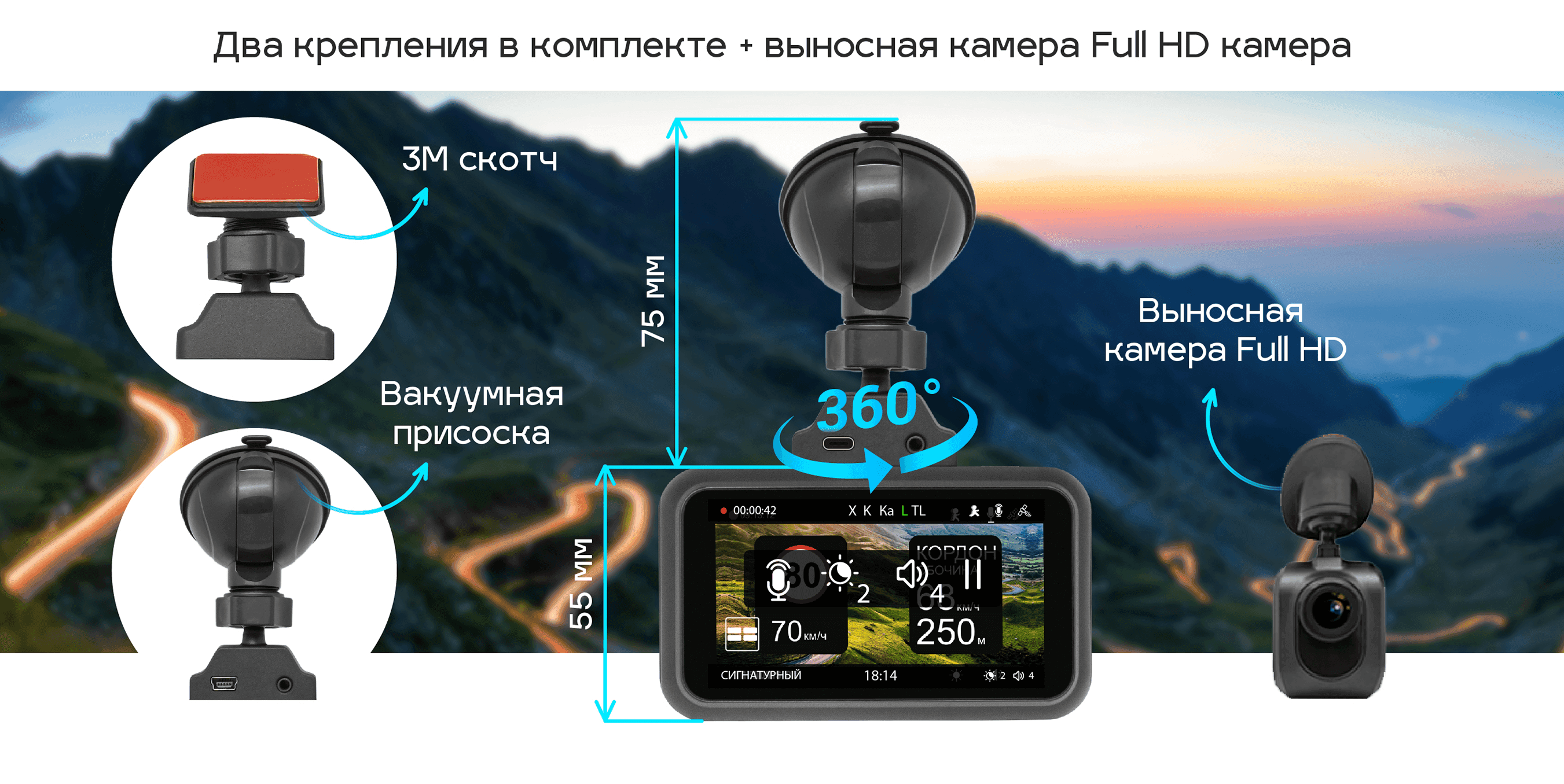 В комплекте предлагается два варианта кронштейна – с установкой на 3М скотче и на вакуумной присоске.