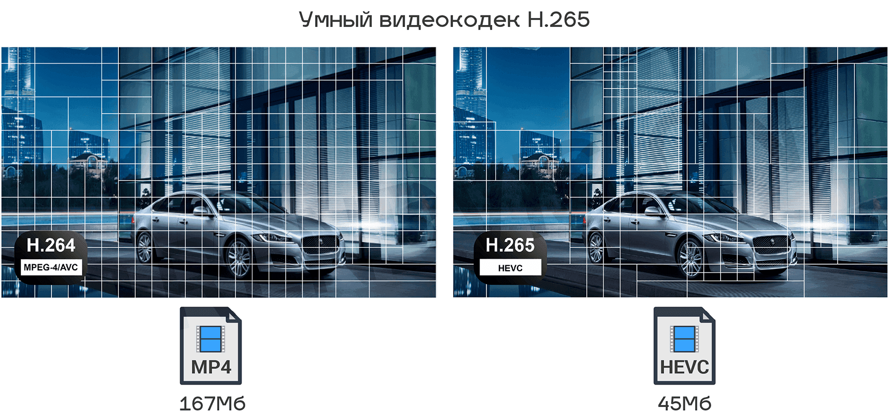 Данный аппарат имеет умный видеокодек нового поколения H.265, который значительно сжимает размеры итоговых видеофайлов (до 30% экономии места на карте памяти), сохраняя при этом качество изображения.