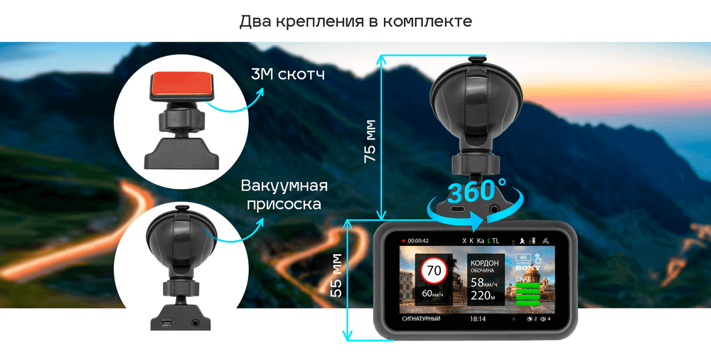 В комплекте предлагается два варианта кронштейна – с установкой на 3М скотче и на вакуумной присоске.