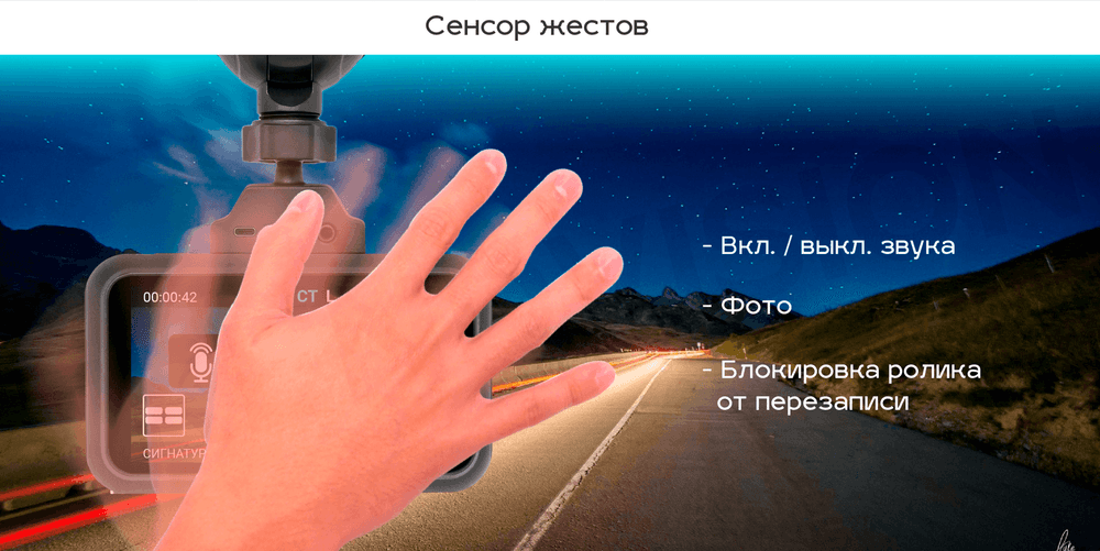 TrendVision Hybrid Signature Real 4K оснащён высокочувствительным сенсором жестов, благодаря которому есть возможность одним взмахом руки перед аппаратом выключить и включить звук, сделать фото или заблокировать текущий ролик от перезаписи.