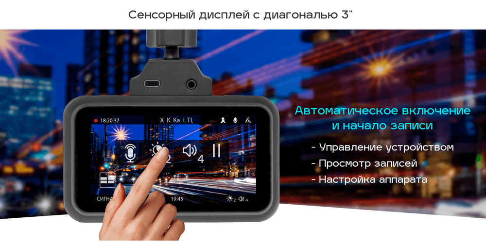 Настройка и управление устройством (а также просмотр фото и видео) может производится прямо на сенсорном 3" экране устройства. Антибликовое покрытие и яркие краски интерфейса гарантируют удобное и доступное использование всех возможностей TrendVision Hybrid Signature Real 4K. Также, есть функция отключения дисплея с сохранением на нём только скорости и времени.