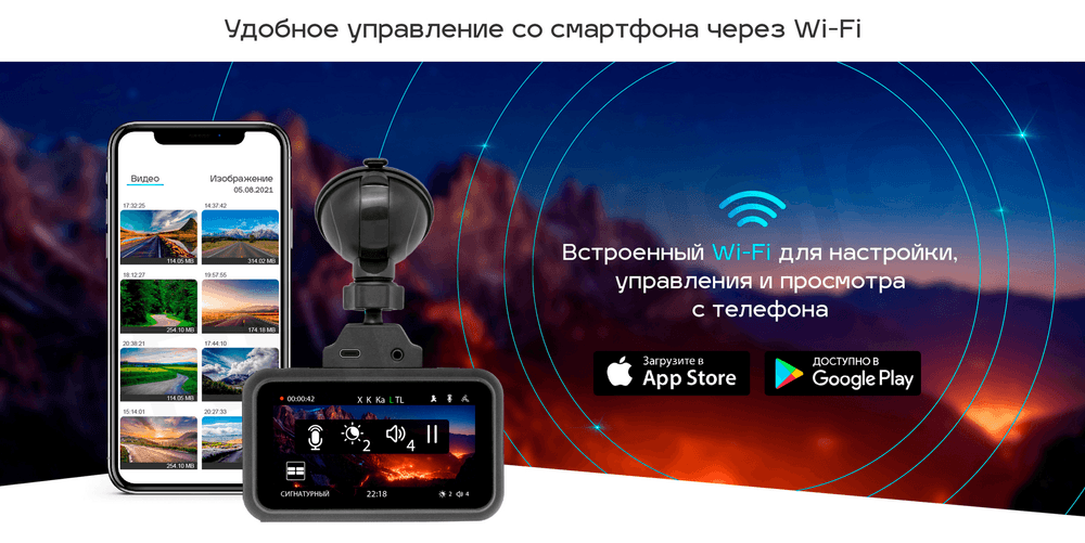 Аппарат оснащён встроенным Wi-Fi-модулем, который позволяет управлять устройством (настройка, запись и просмотр видео) прямо с мобильного телефона. Удобное приложение «TV Connect», созданное специально под аппараты TrendVision, можно скачать в App Store и Google Play. (Подключение к приложению на смартфоне осуществимо только от оригинального зарядного устройства или зарядного устройства с параметрами заявленными в характеристиках).