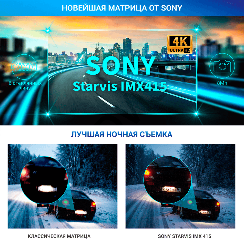 Аппарат оснащён матрицей SONY STARVIS IMX415 – одной из лучших на рынке авторегистраторов на 2022 год! Устройство снимает в реальном разрешении 4K Ultra HD, без интерполяции. Качество картинки достигает той степени, при которой днём и ночью, в дождь и солнце, аппарат не теряет ни единой детали происходящего на дороге – всегда четко видны номера машин, знаки дорожного движения и даже, в отдельных случаях, лица людей.