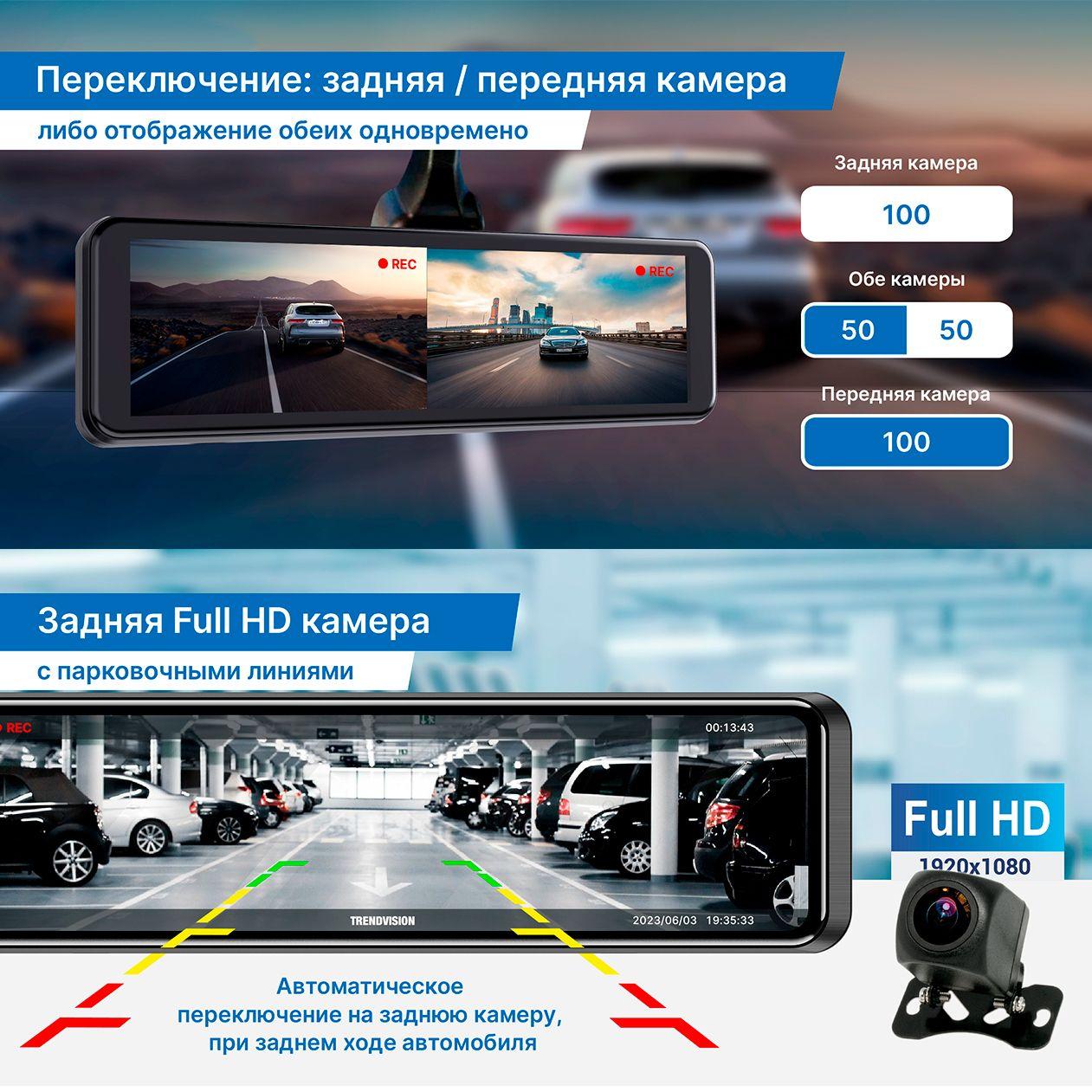 Переключать вид с задней / передней камеры на TrendVision MR-1100 (AI Smart Assist) можно одним прикосновением пальца по сенсорному экрану. Также, можно включить отображение сразу с обеих камер.