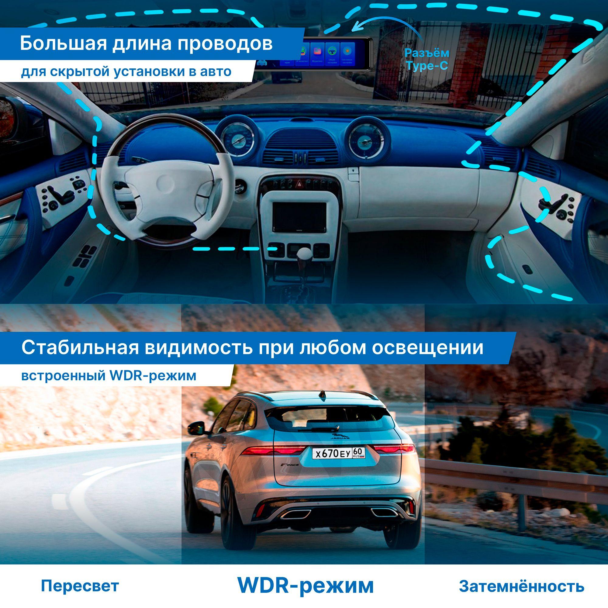 Провод задней камеры и провод питания (с разъёмом Type-C) обладают оптимальной длиной проводов для возможности скрытно провести их по изолированным областям автомобиля (под обшивкой, стойкой и т.д.). Таким образом сам видеорегистратор-зеркало и задняя камера будут выглядеть в машине, как штатные.