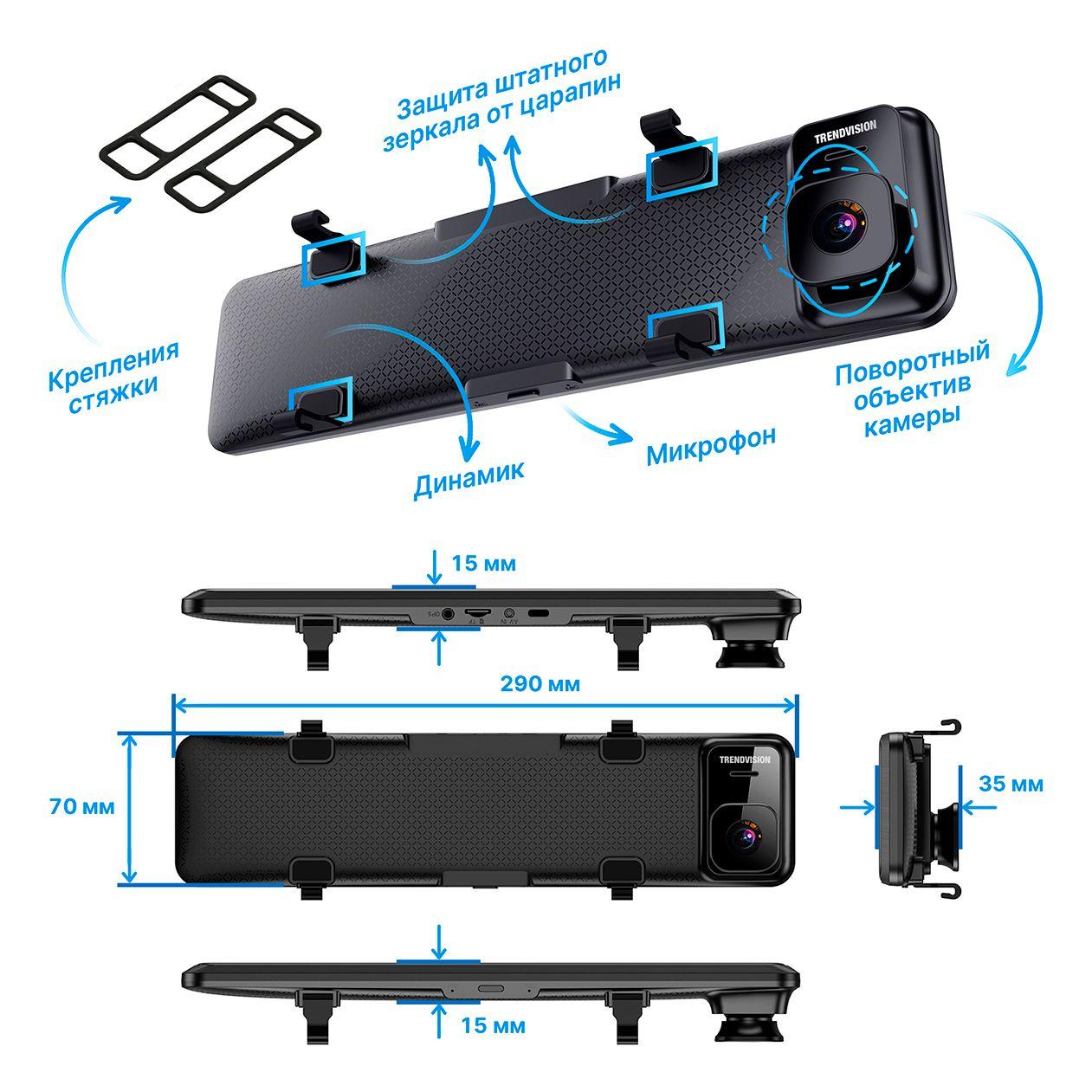 Универсальные и быстросъёмные крепления-стяжки позволяют легко установить аппарат на штатное зеркало практически в любом автомобиле. К тому же, на задней стороне видеорегистратора есть специальные прорезиненные защитные платформы, которые обезопасят штатное зеркало от царапин. Также объектив может прокручиваться в разные стороны, поэтому всегда можно настроить кадр под собственные нужды.