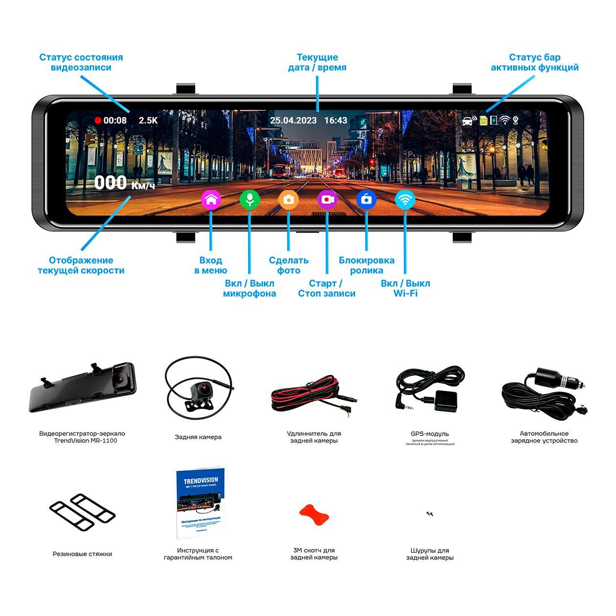 TrendVision MR-1100 (AI Smart Assist) – умный двухкамерный автомобильный видеорегистратор, выполненный в корпусе накладки на штатное зеркало заднего вида, с AI-сопровождением (8 режимов) и съёмкой в 2К / 4K. Благодаря выносному GPS-модулю, яркому сенсорному экрану, широкому перечню возможностей AI-ассистента и остальным полезным функциям, данная модель в десятки раз преумножает удобство и безопасность вождения автомобиля, в сравнении с использованием классических видеорегистраторов.