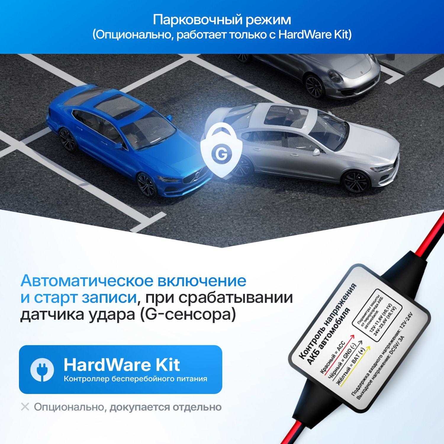 Устройство поддерживает режим парковки, который активируется при подключении питания через специальный кабель HardWare Kit. В таком режиме видеорегистратор может фиксировать события на стоянке и сохранять важные моменты даже после выключения зажигания.