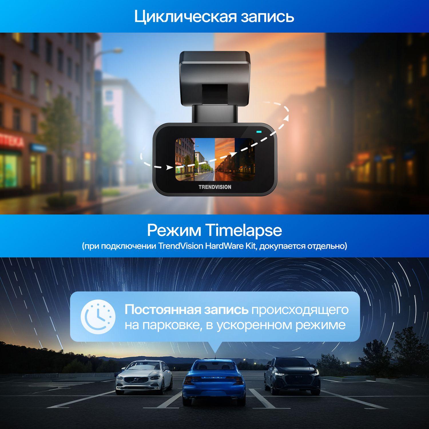 Помимо стандартного парковочного режима, модель поддерживает Таймлапс, который также работает только при подключении через HardWare Kit. Этот режим позволяет вести длительную запись в экономичном формате и сохранять общую картину происходящего вокруг автомобиля во время стоянки.