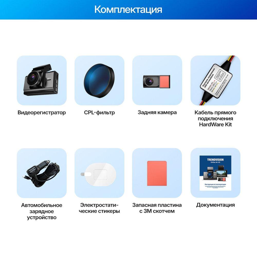 В комплекте с устройством идут дополнительная камера, антибликовый CPL-фильтр и кабель постоянного питания TrendVision HardWare Kit, обеспечивающий полноценную работу парковочного режима.
