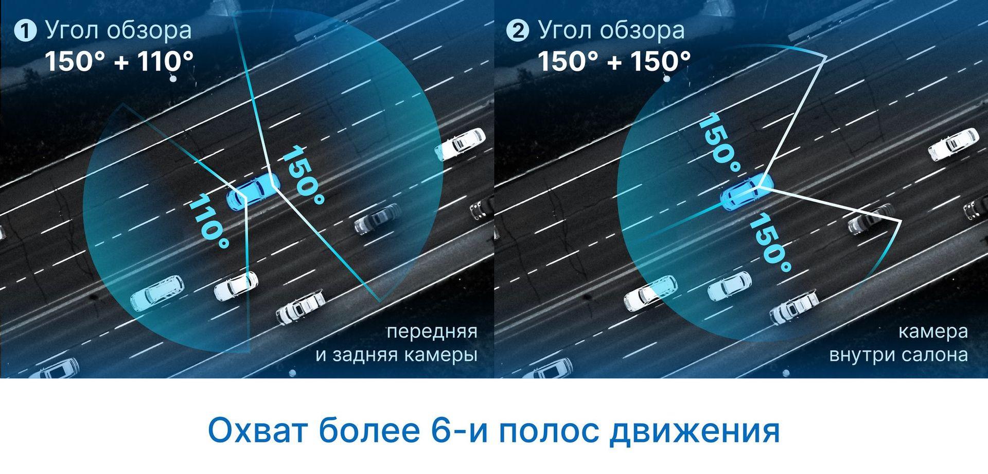 TrendVision Proof 360 GPS снимает с увеличенным углом обзора: 150° у фронтальной и боковых камер, 110° у задней. Запись охватывает более 6 полос движения без излишних искажений по краям кадра.