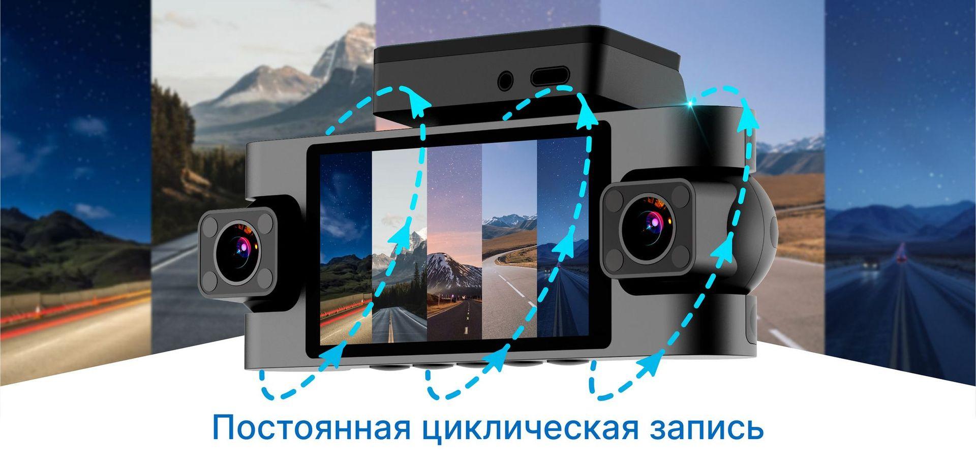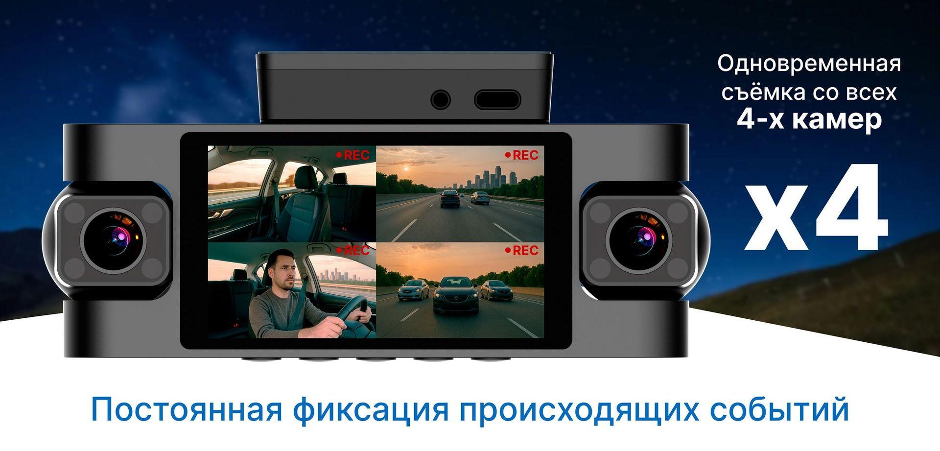 - Одновременная запись событий спереди, сзади автомобиля, в салоне и по бокам автомобиля
