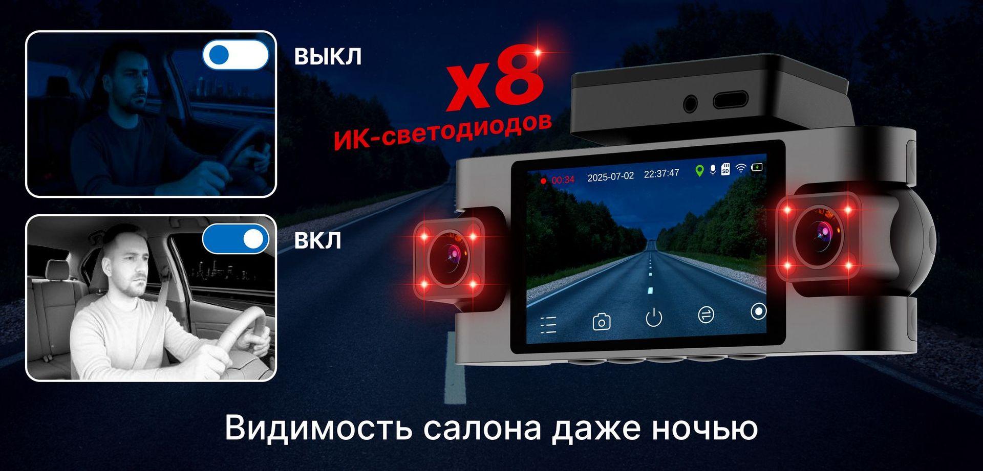 - 8 ИК-светодиодов для обеспечения ночной съёмки в салоне автомобиля