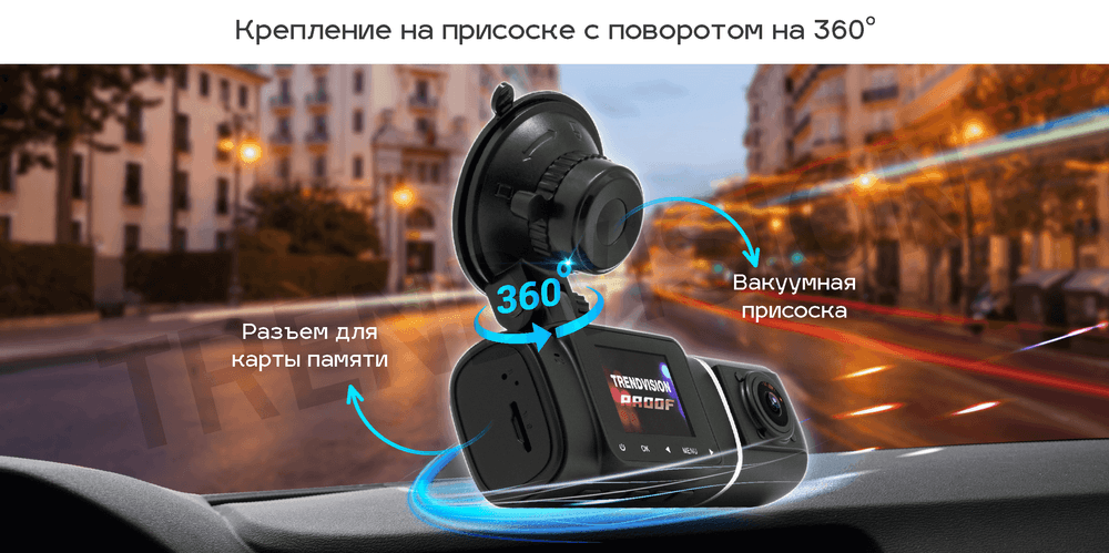 TrendVision Proof PRO GPS – автомобильный видеорегистратор с двумя Full HD камерами в одном компактном корпусе. Одна из камер вращается на 250° и имеет 4 ИК-светодиода – это позволяет вести съёмку одновременно как дороги перед машиной, так и ситуации внутри салона, при любых условиях освещения. GPS-модуль, автоматически определяющий дату, время, скорость и координаты - в комплекте.