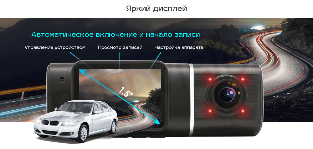 Компактный Full HD видеорегистратор с 2 камерами в 1 корпусе и 4 ИК-светодиодами для ночной съёмки. GPS-модуль и задняя камера в комплекте.