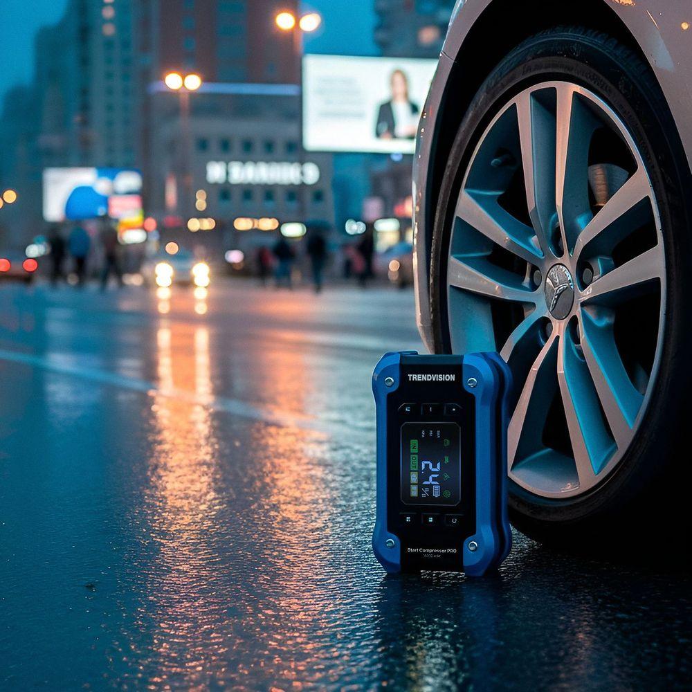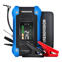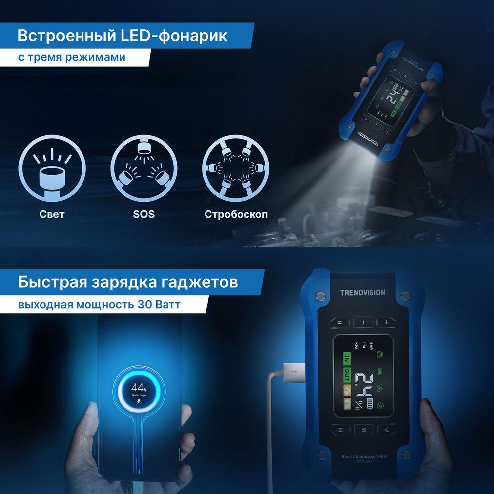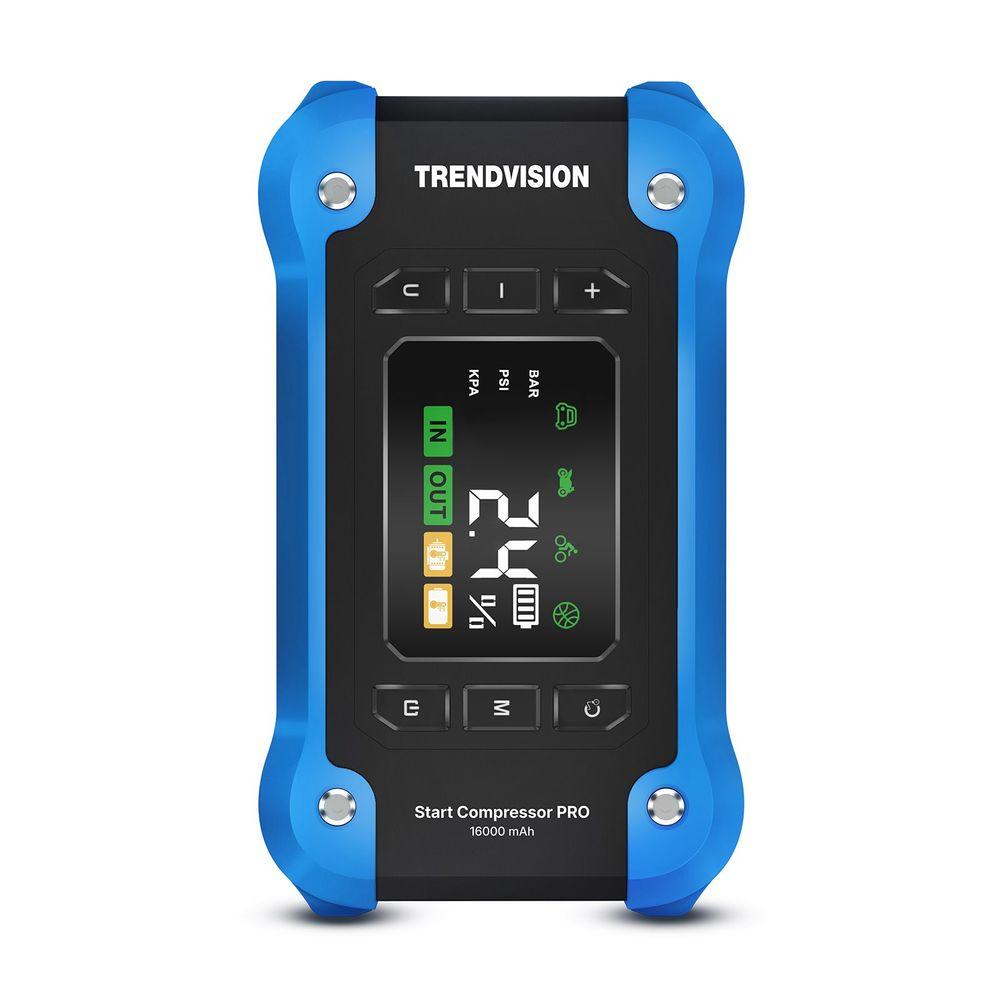 TrendVision Start Compressor PRO — это универсальное устройство «четыре в одном», сочетающее в себе пуско-зарядное устройство, беспроводной компрессор, powerbank и фонарик. Оснащённый ёмким аккумулятором на 16 000 мАч, он способен запускать двигатель любого транспортного средства при полностью разряженной батарее или в условиях сложного зимнего пуска. Помимо этого, прибор позволяет быстро и без лишних усилий подкачать колёса автомобиля благодаря встроенному компрессору, а также зарядить смартфоны, планшеты и другую электронику, используя функцию внешнего аккумулятора. Дополнительным преимуществом является встроенный фонарик, который выручит в дороге в тёмное время суток.