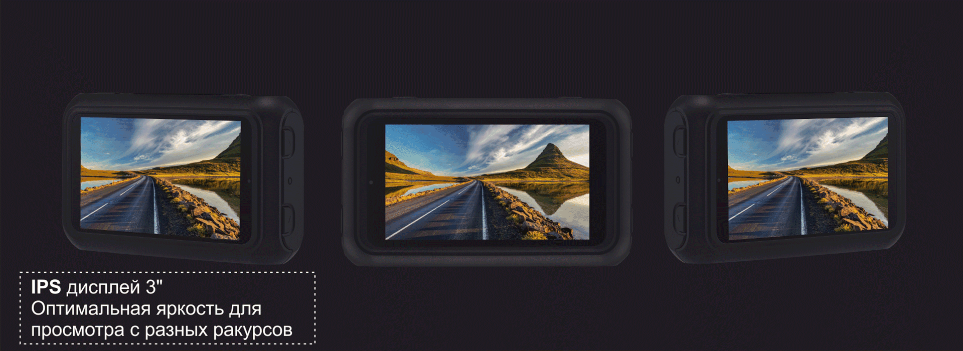 Крупный 3-дюймовый дисплей позволяет разместить всю необходимую информацию с достаточно крупным шрифтом. Матрица по технологии IPS – залог широкого угла обзора. В настройках регистратора можно задать уровень яркости раздельно для дня и для ночи, что устраняет необходимость постоянной, даже ежедневной ручной регулировки.