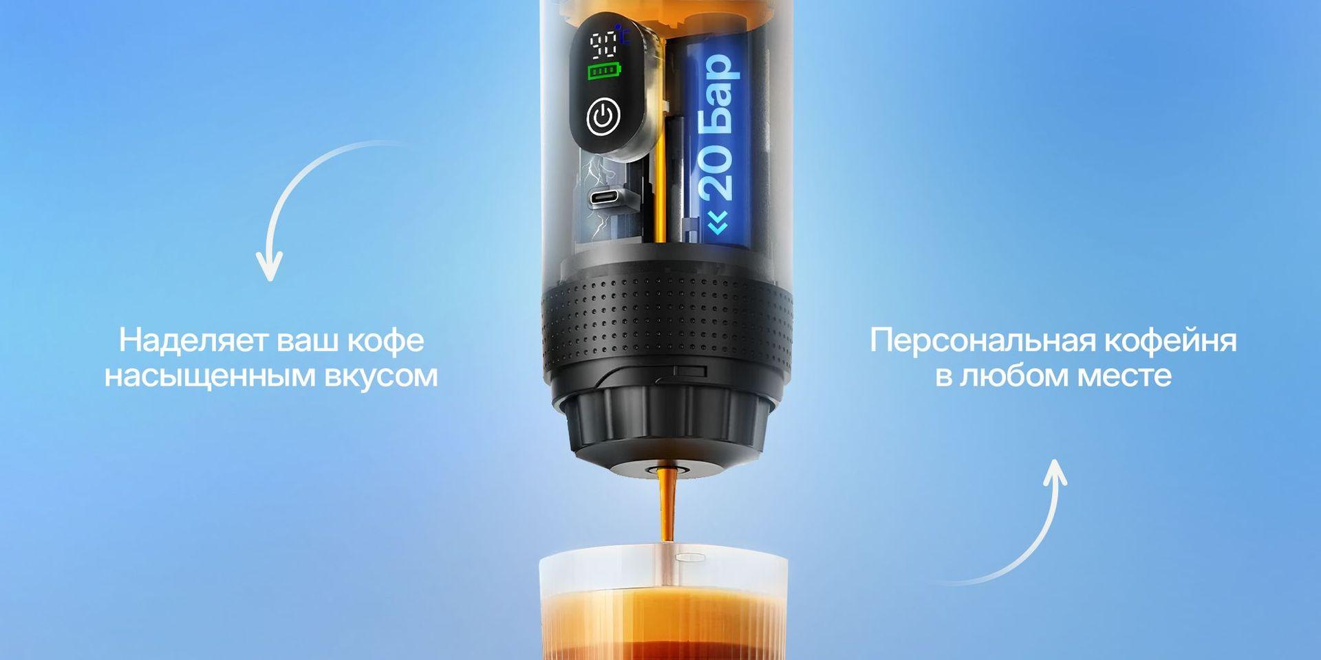 Кофемашина выполнена в компактном дорожном формате и легко помещается в бардачок автомобиля, рюкзак или сумку. Устройство удобно держать в руке и брать с собой каждый день — оно действительно рассчитано на мобильное использование.