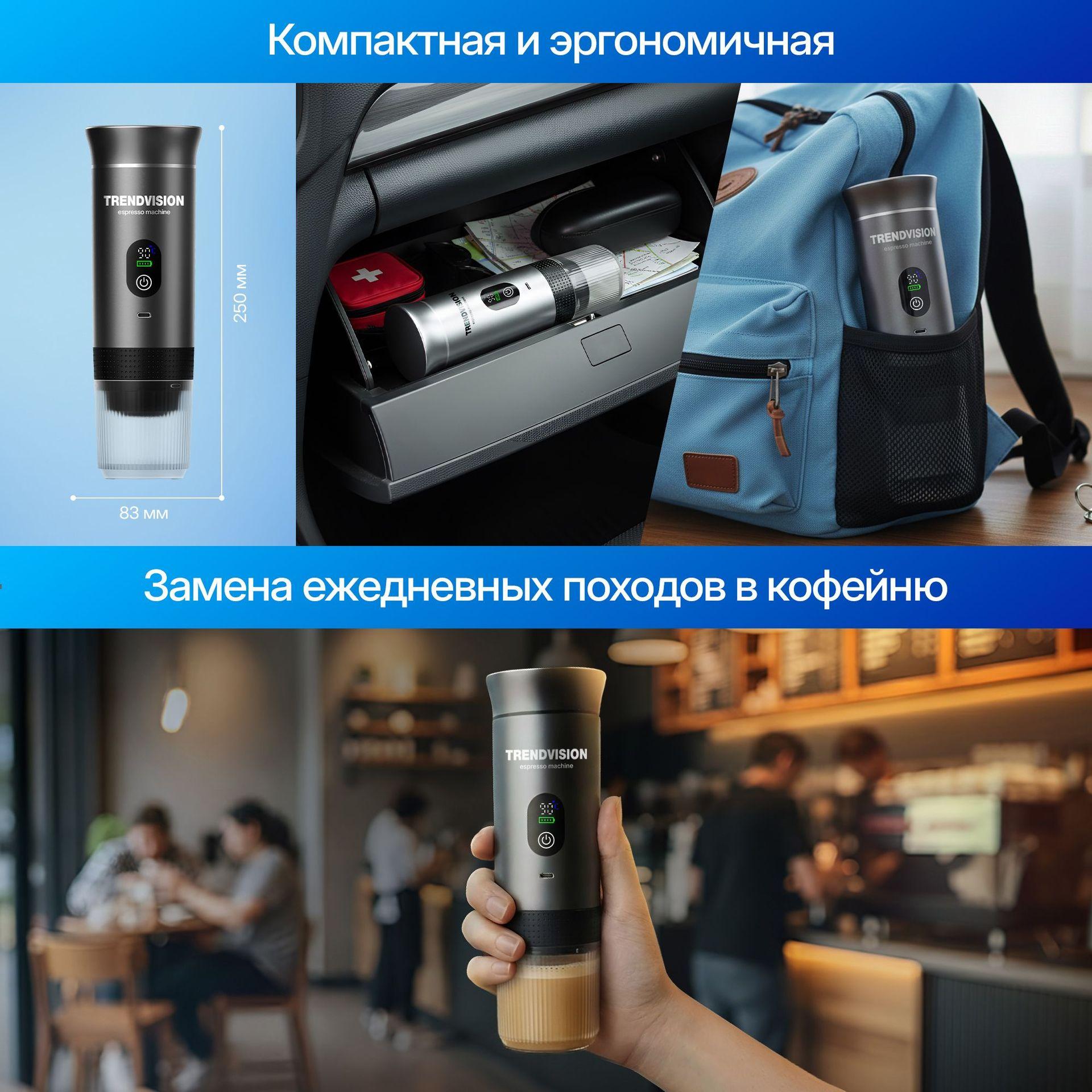 TrendVision Travel Coffee Maker (TCM-240h) (Grey) — это портативная кофемашина, созданная для тех, кто хочет пить качественный кофе в любом месте, не завися от розетки, кофейни или стационарной кухни. Она готовит полноценный эспрессо (и другие кофейные напитки) там, где вы находитесь: в дороге, в офисе, в путешествии, на даче или в кемпинге. Устройство ориентировано на людей с активным образом жизни, которые ценят вкус, автономность и удобство.