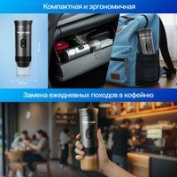 Кофемашина выполнена в компактном дорожном формате и легко помещается в бардачок автомобиля, рюкзак или сумку. Устройство удобно держать в руке и брать с собой каждый день — оно действительно рассчитано на мобильное использование.