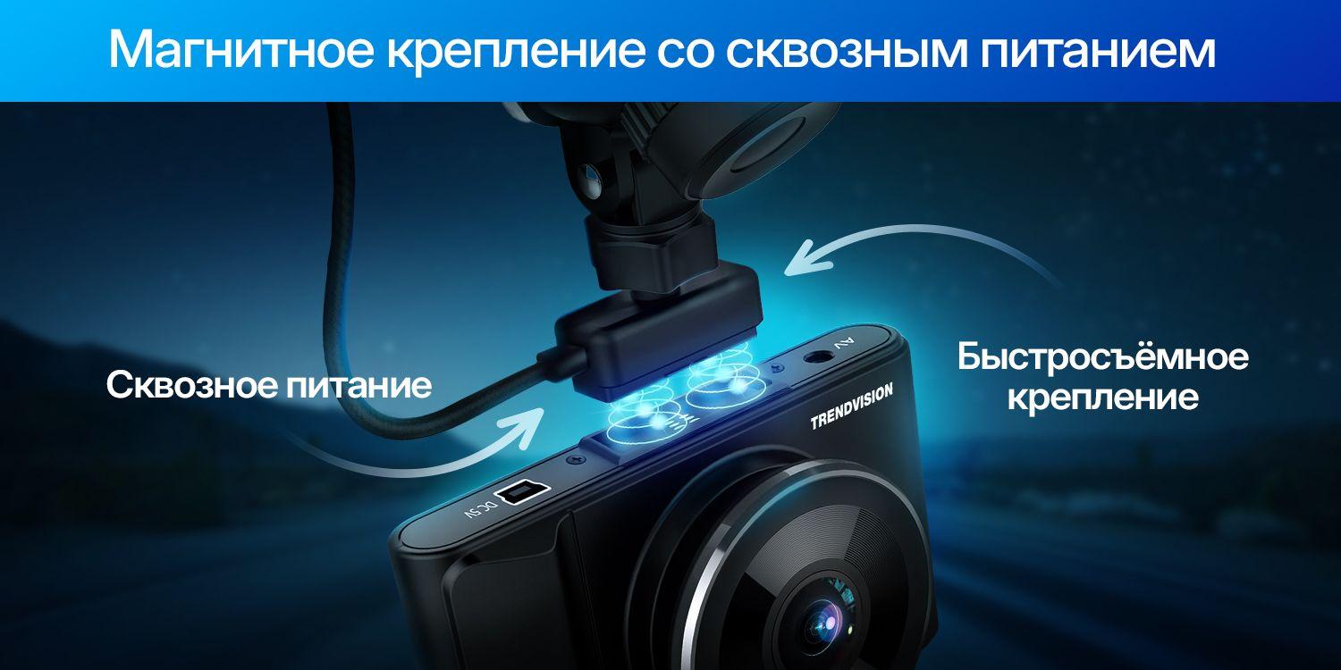 Магнитное крепление делает использование видеорегистратора максимально удобным — устройство легко снять или установить всего одним движением руки. Благодаря технологии сквозного питания отпадает необходимость постоянно подключать кабель, что не только упрощает эксплуатацию, но и защищает разъёмы от износа.