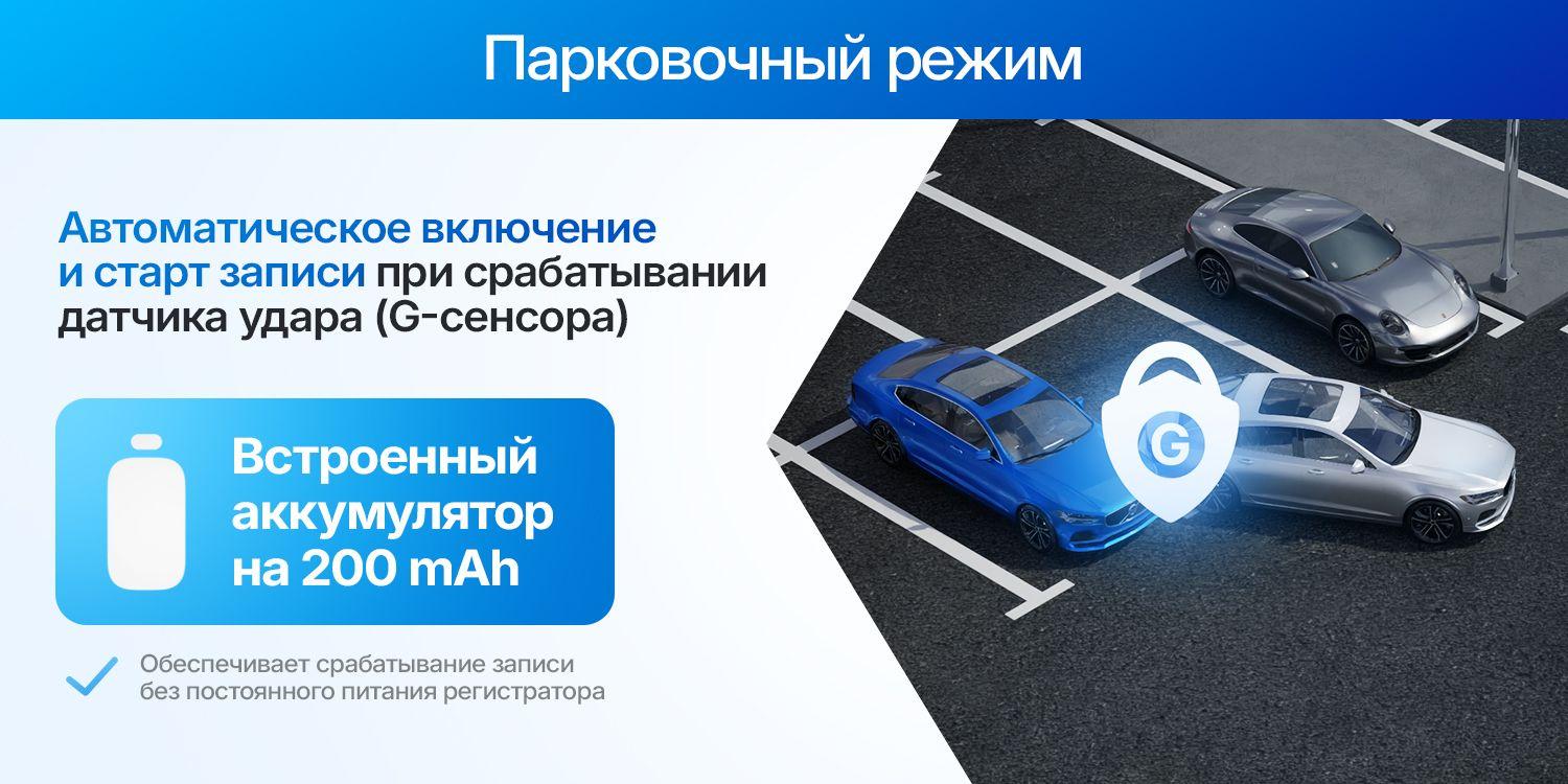 Благодаря парковочному режиму видеорегистратор остаётся на страже даже после выключения зажигания. Если автомобиль заденут на стоянке, устройство автоматически включится на несколько секунд и зафиксирует инцидент вместе с номерами автомобиля-нарушителя. Такая возможность обеспечивается встроенным аккумулятором ёмкостью 200 мА·ч, которого достаточно для активации записи в нужный момент.