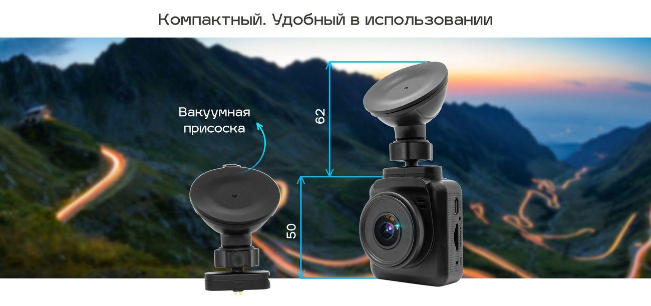 Видеорегистратор имеет размер, не превышающий 5 см в длину и ширину, за счёт чего минимизируется препятствование видимости дороги водителем при движении.