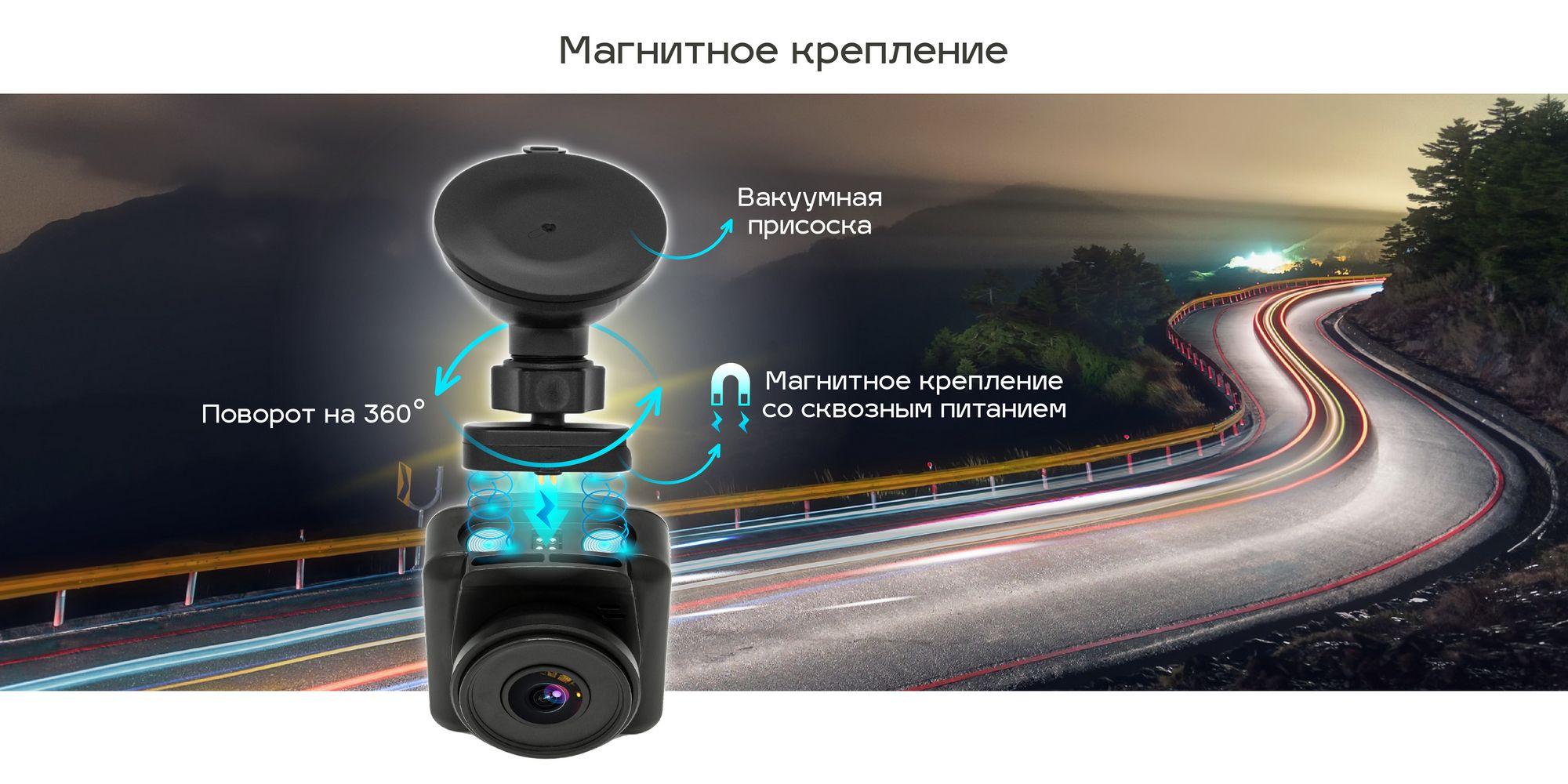 Быстросъёмное магнитное крепление значительно облегчает использование регистратора. Одним движением руки вы можете снять или установить аппарат. Технология сквозного питания избавляет от лишних проводов и предотвращает изнашиваемость разъёмов.