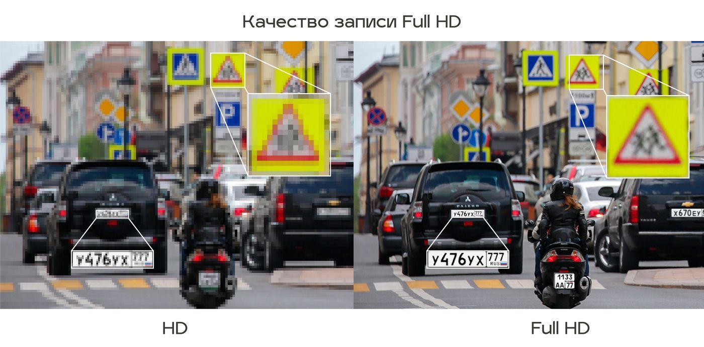Несмотря на компактность, видеорегистратор ведёт качественную съемку в формате Full HD (1920x1080p), благодаря чему на записи видны номерные знаки встречных автомобилей, придорожные указатели и разметка.