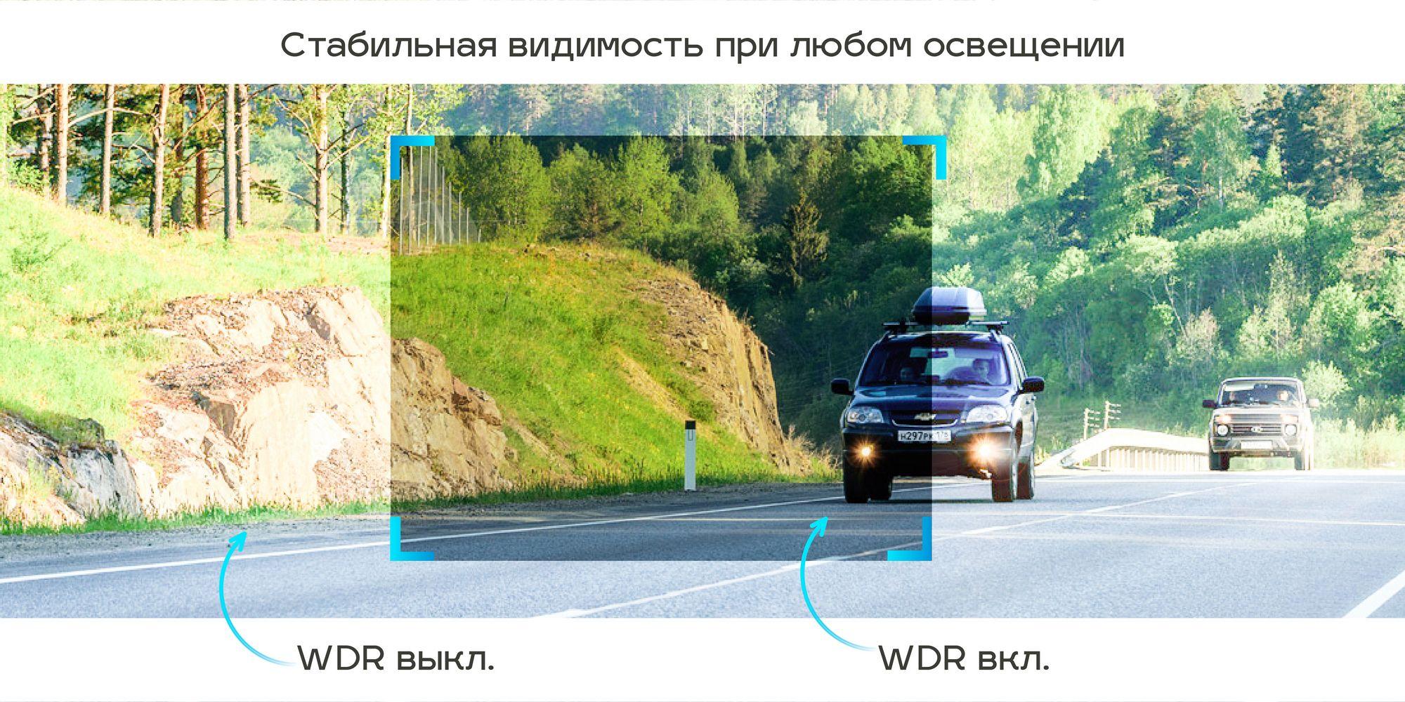 Обеспечивает сбалансированное изображение с сохранением деталей и цветов, как при излишне низком освещении, так и явном «пересвете» в кадре. Благодаря WDR номера едущих машин читаемы даже при сильном свете фар или фонарей.