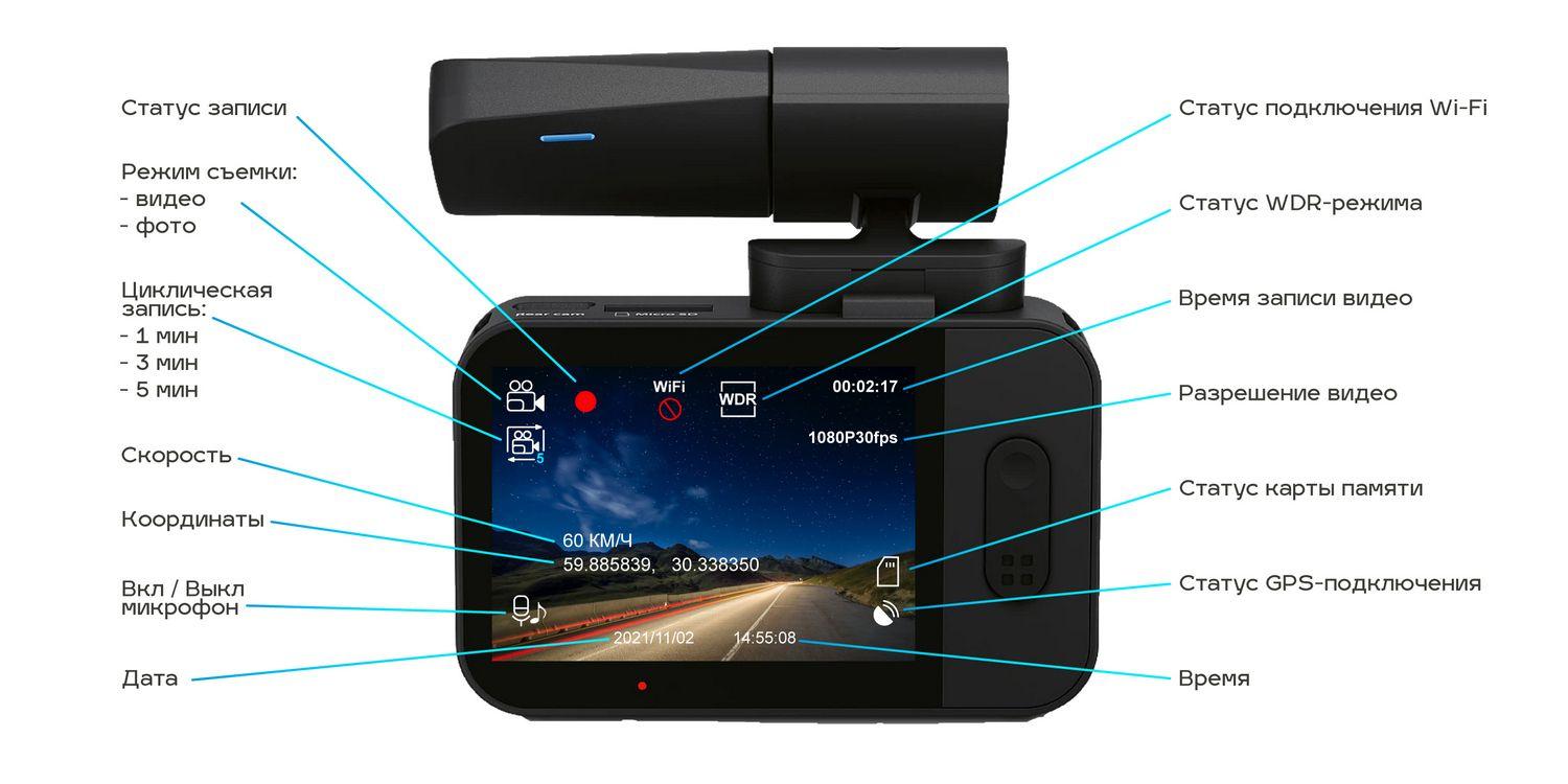 Встроенный Wi-Fi модуль обеспечивает синхронизацию со смартфоном, благодаря специальному мобильному приложению. Управление основными настройками видеорегистратора, а также скачивание и просмотр записанных видео можно производить прямо на экране вашего мобильного устройства. (Подключение к приложению на смартфоне осуществимо только от оригинального зарядного устройства или зарядного устройства с параметрами заявленными в характеристиках).
